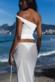 Blusa de malha fluity, toda drapeada e dupla, com decote assimétrico e faixa com nó que envolve o ombro.