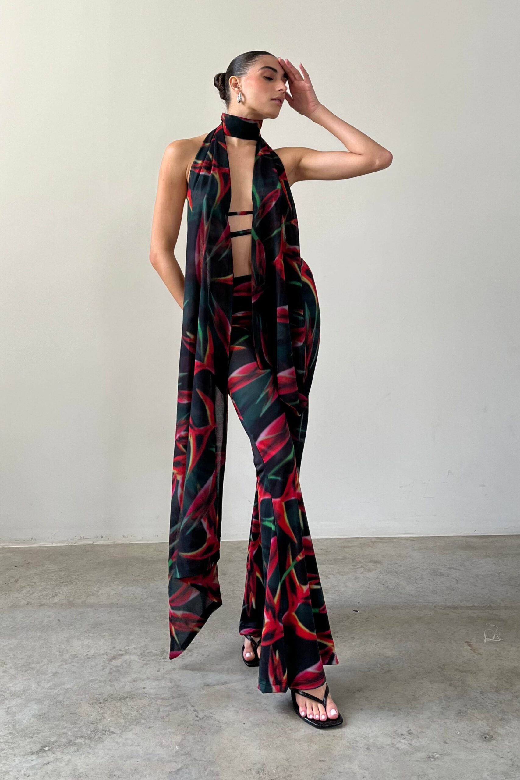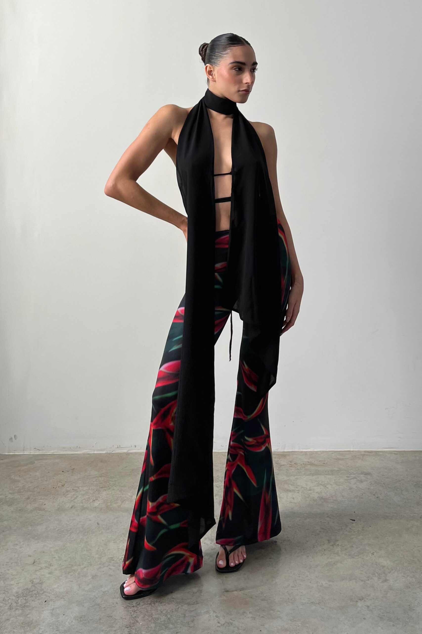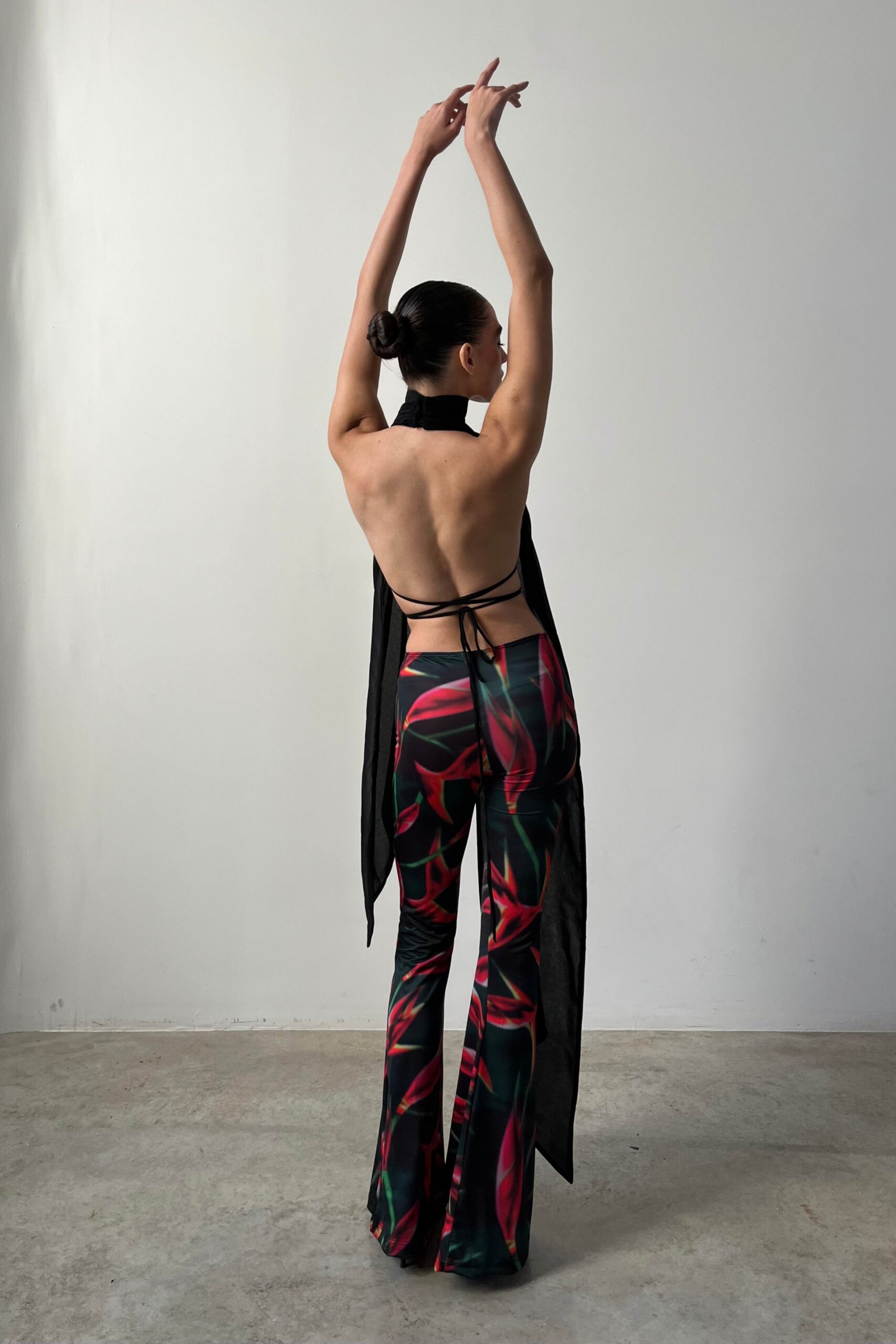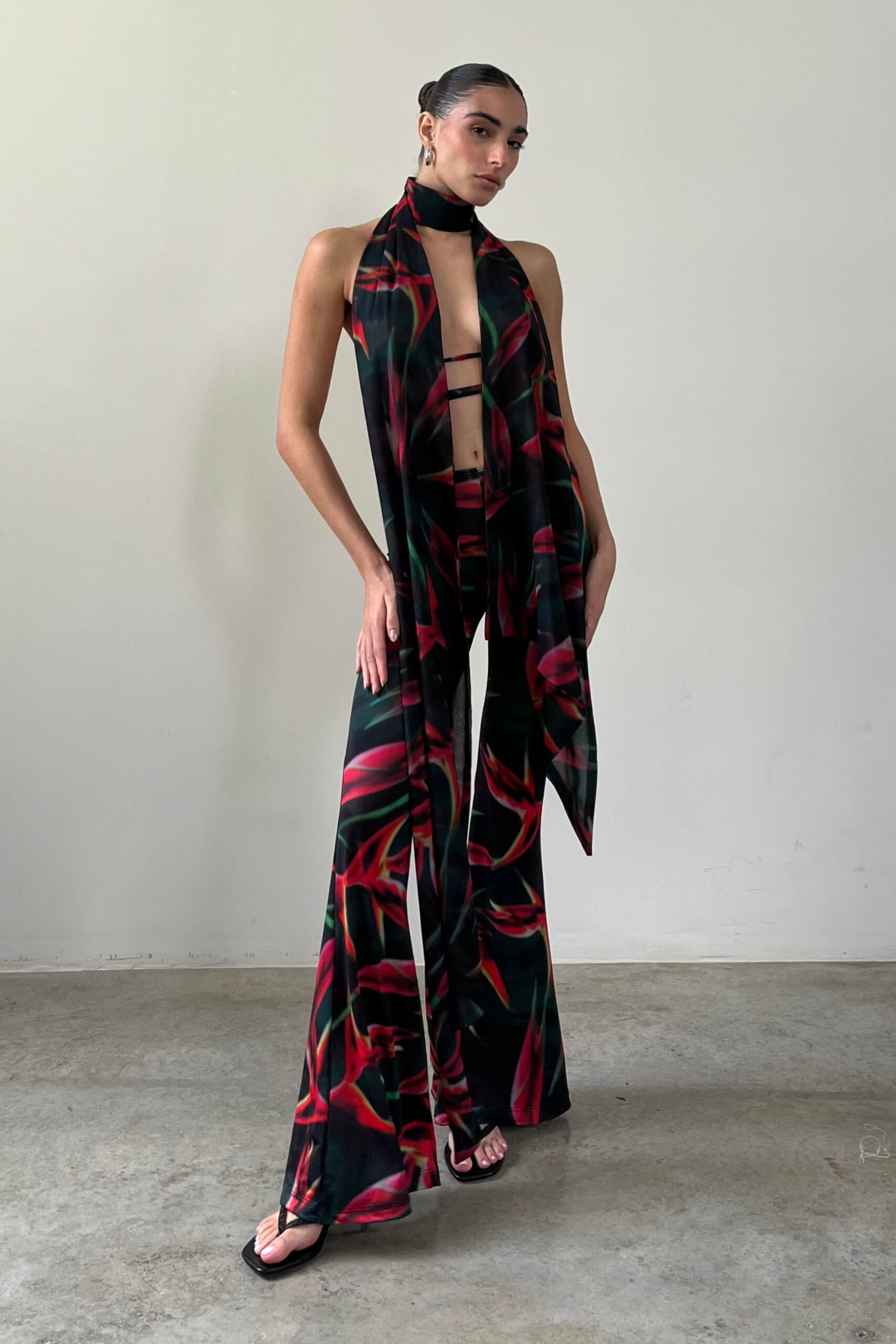 Calça flare de malha com estampa digital exclusiva, modelagem justa.