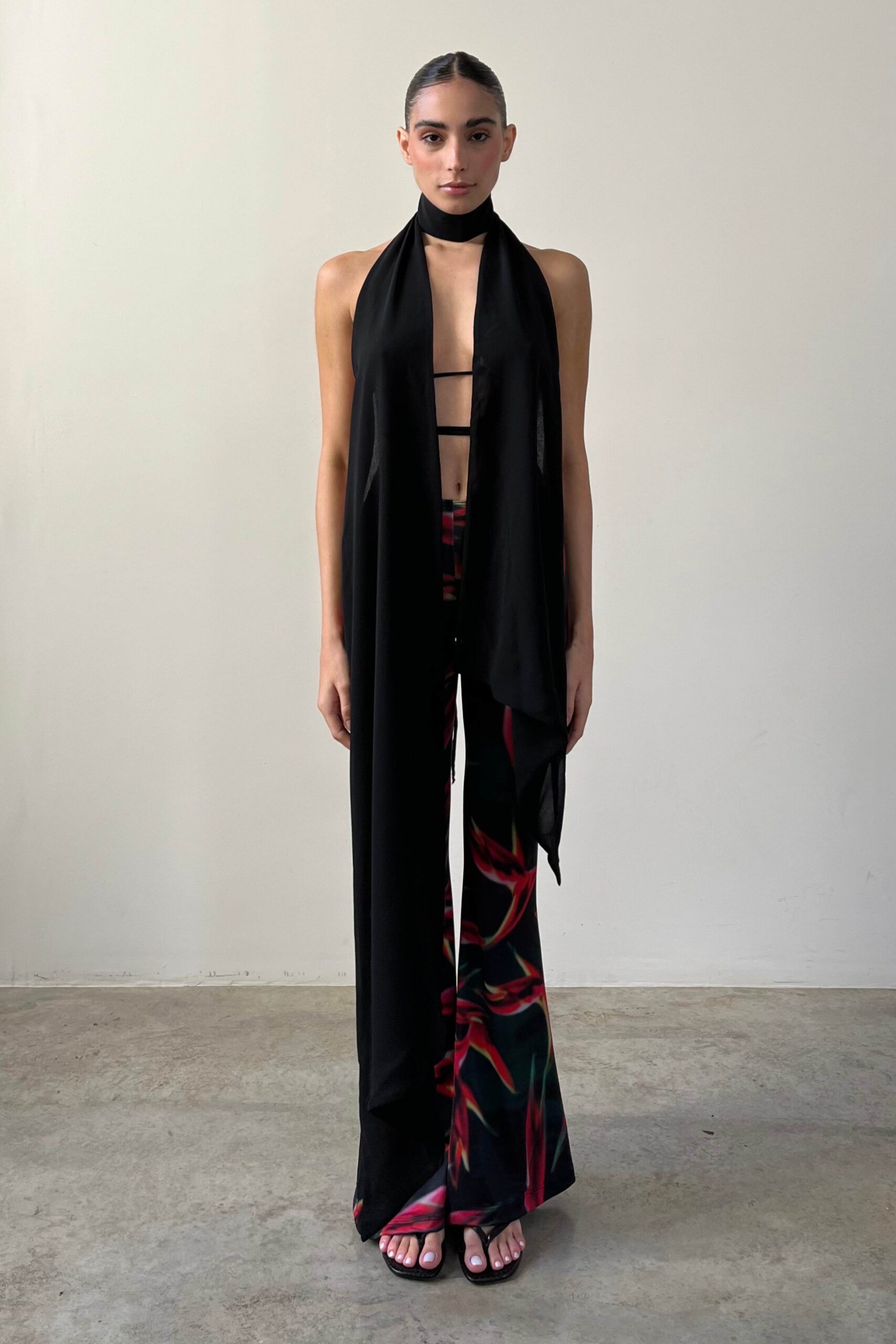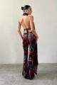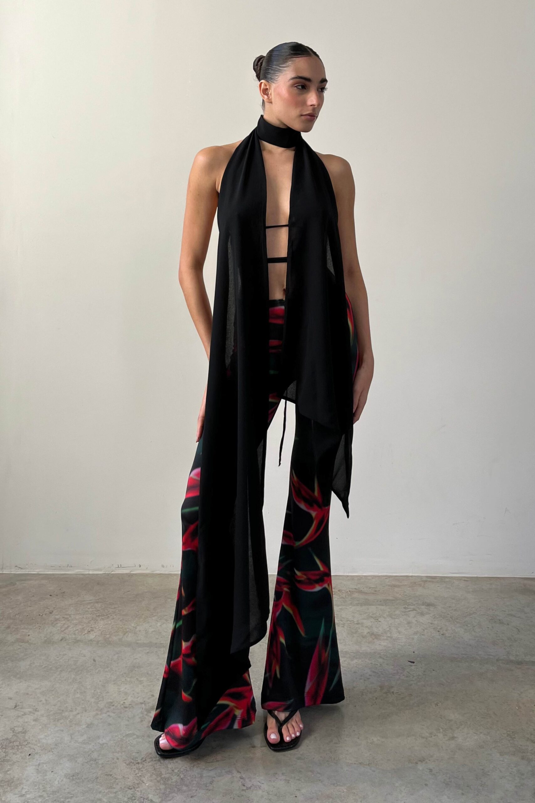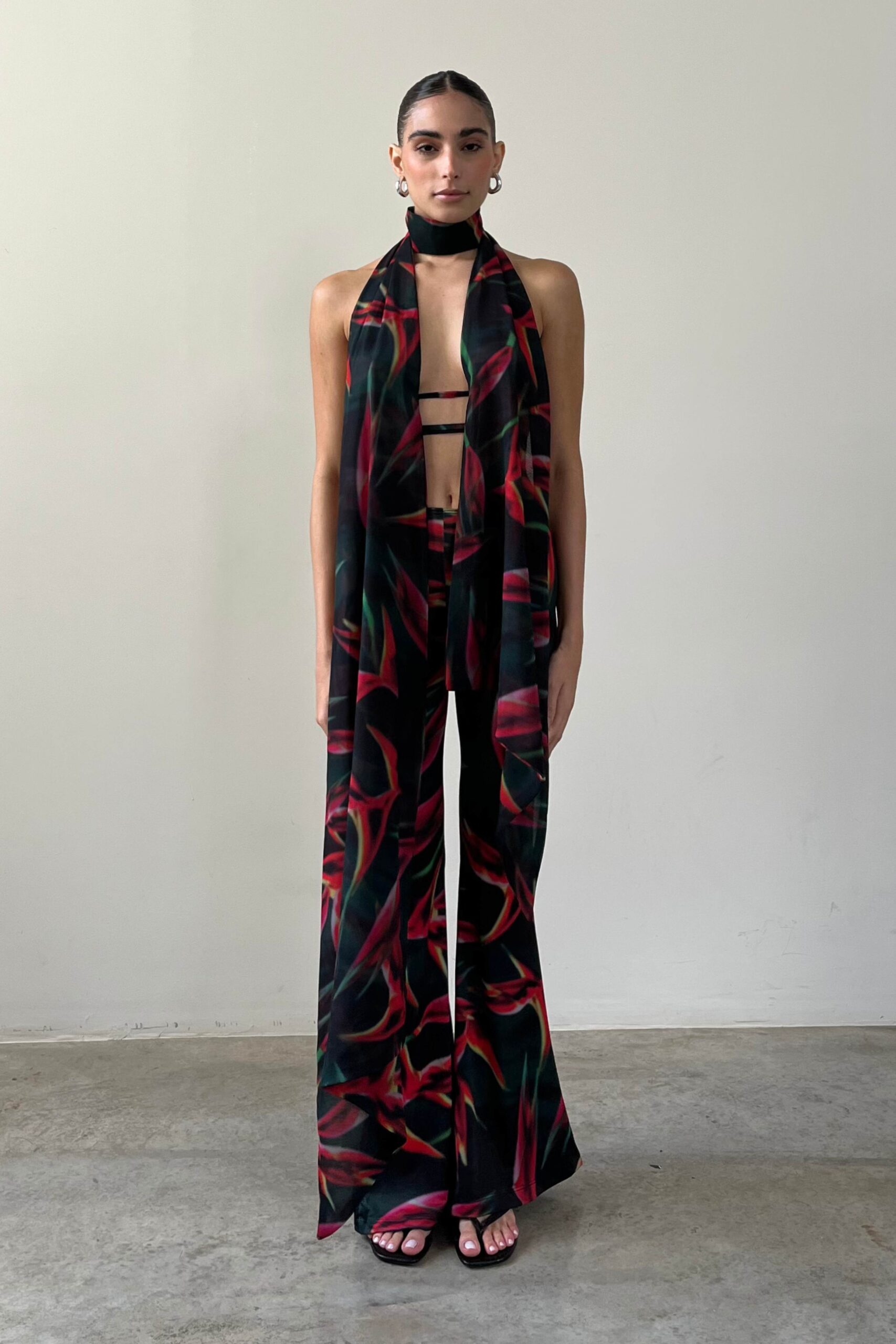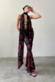 Calça flare de malha com estampa digital exclusiva, modelagem justa.