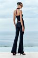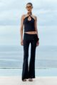 Calça flare de jersey, com cós assimétrico e detalhe de três rosas confeccionadas manualmente em nosso ateliê.