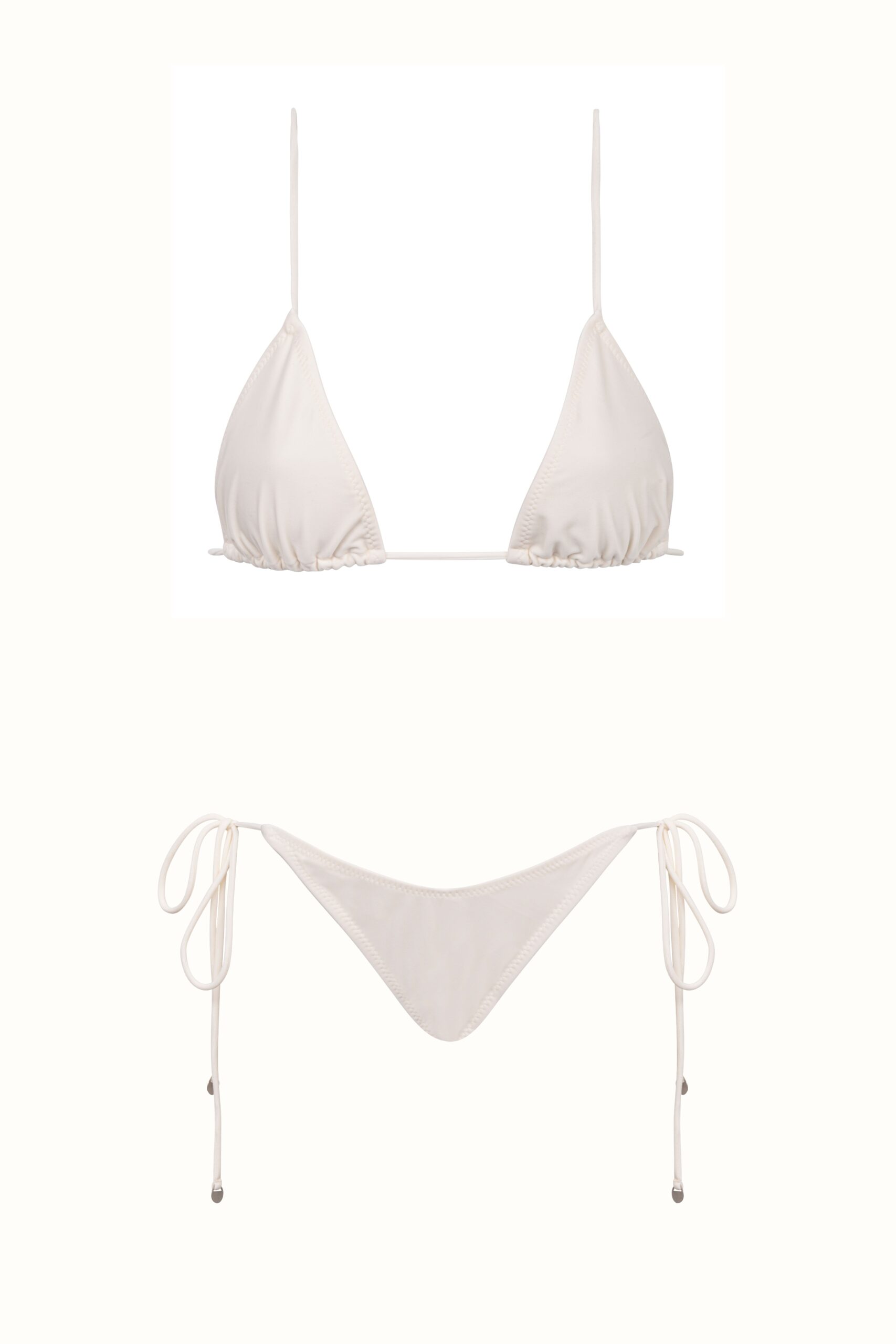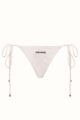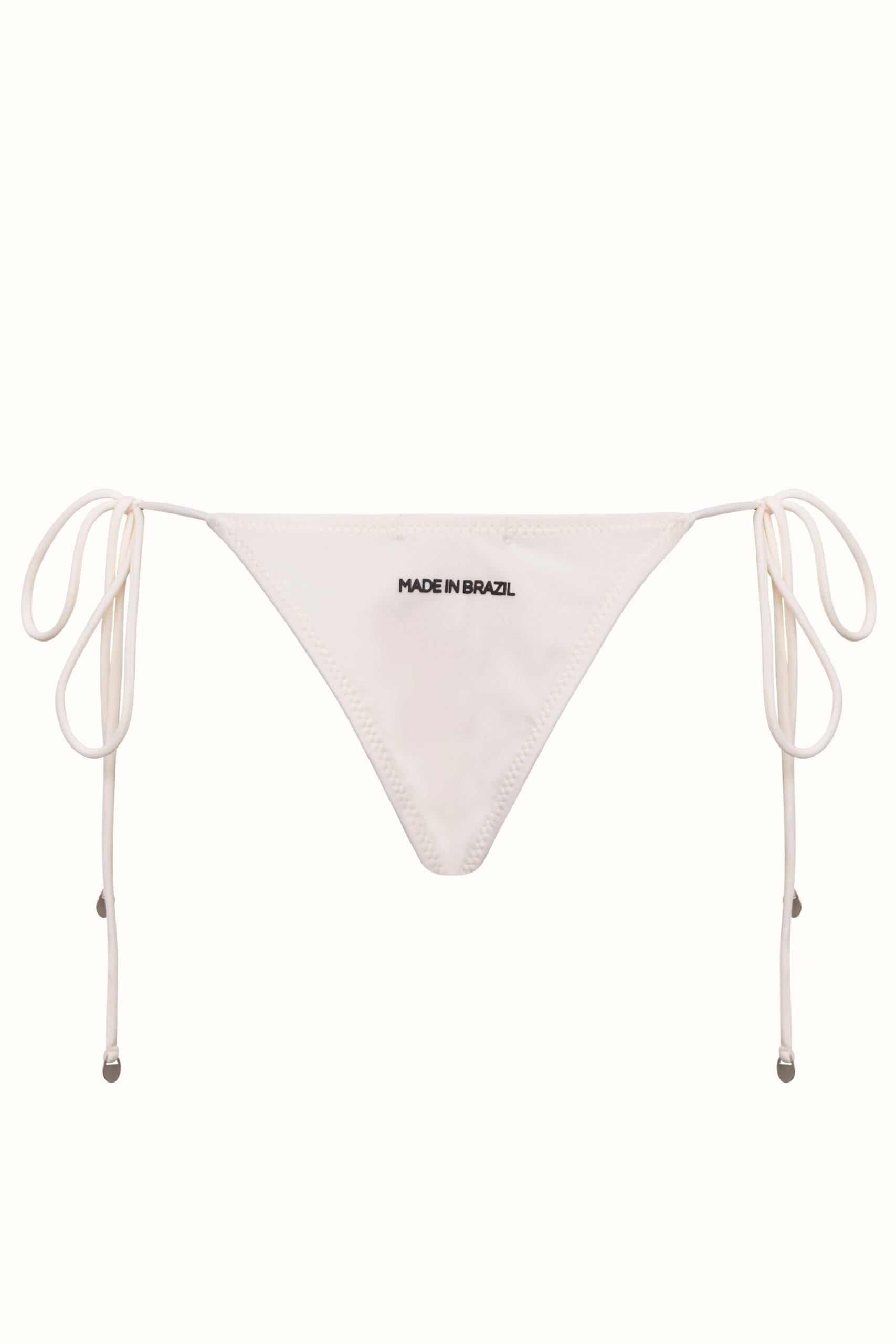 Calcinha de biquíni cortininha de malha, forrado, com amarração lateral de tiras longas, feitas do próprio tecido. Frase “MADE IN BRAZIL” em silk emborrachado de alto relevo.