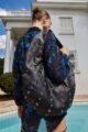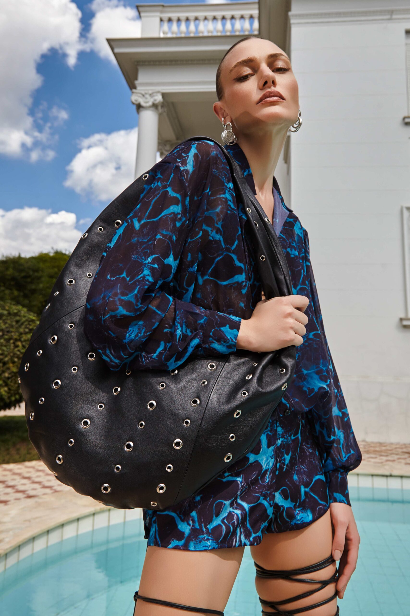 Camisa de musseline oversized com botões de resina e estampa digital exclusiva.