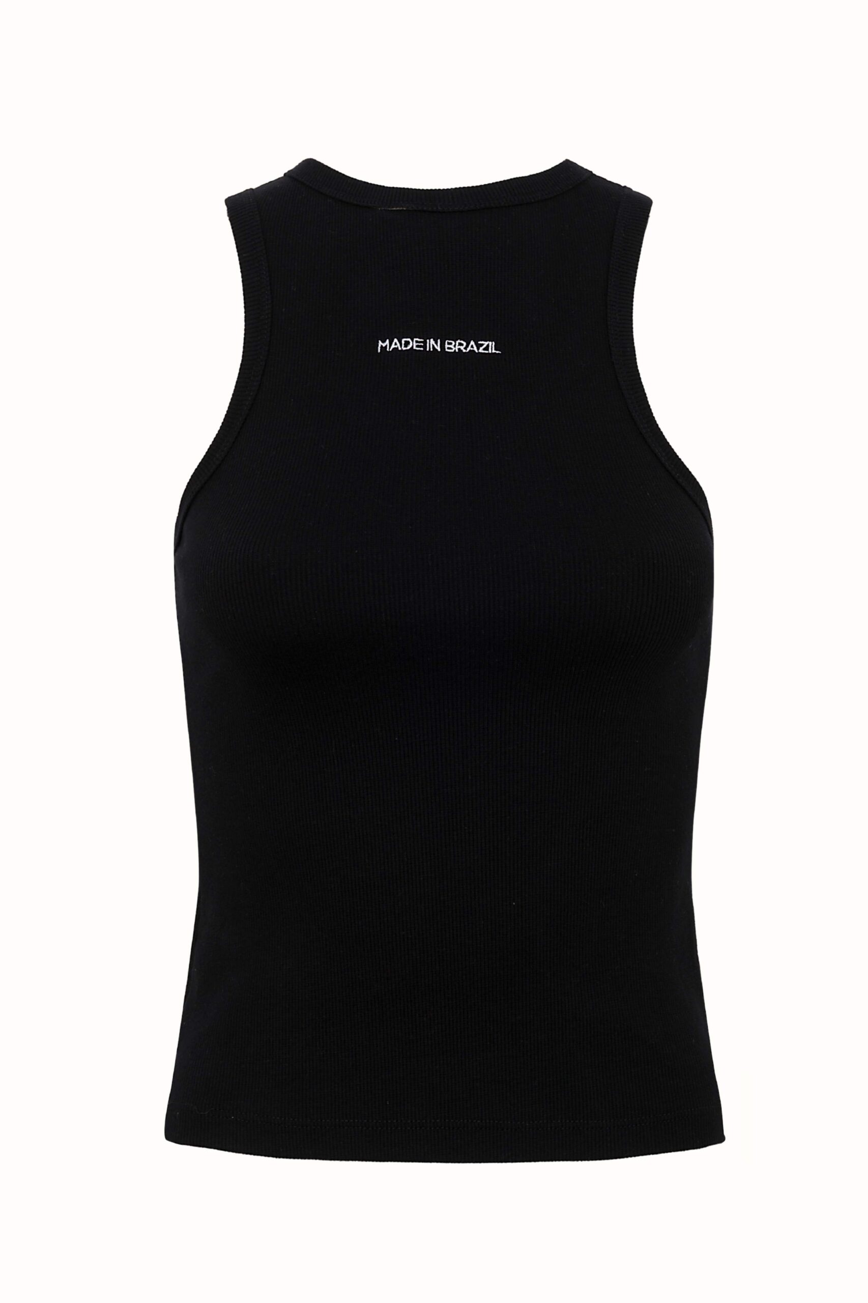 Regata canelada de algodão, decote halter e com a frase “MADE IN BRAZIL” bordada.