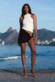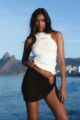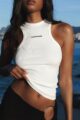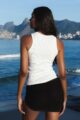 Regata canelada de algodão, decote halter e com a frase “MADE IN BRAZIL” bordada.