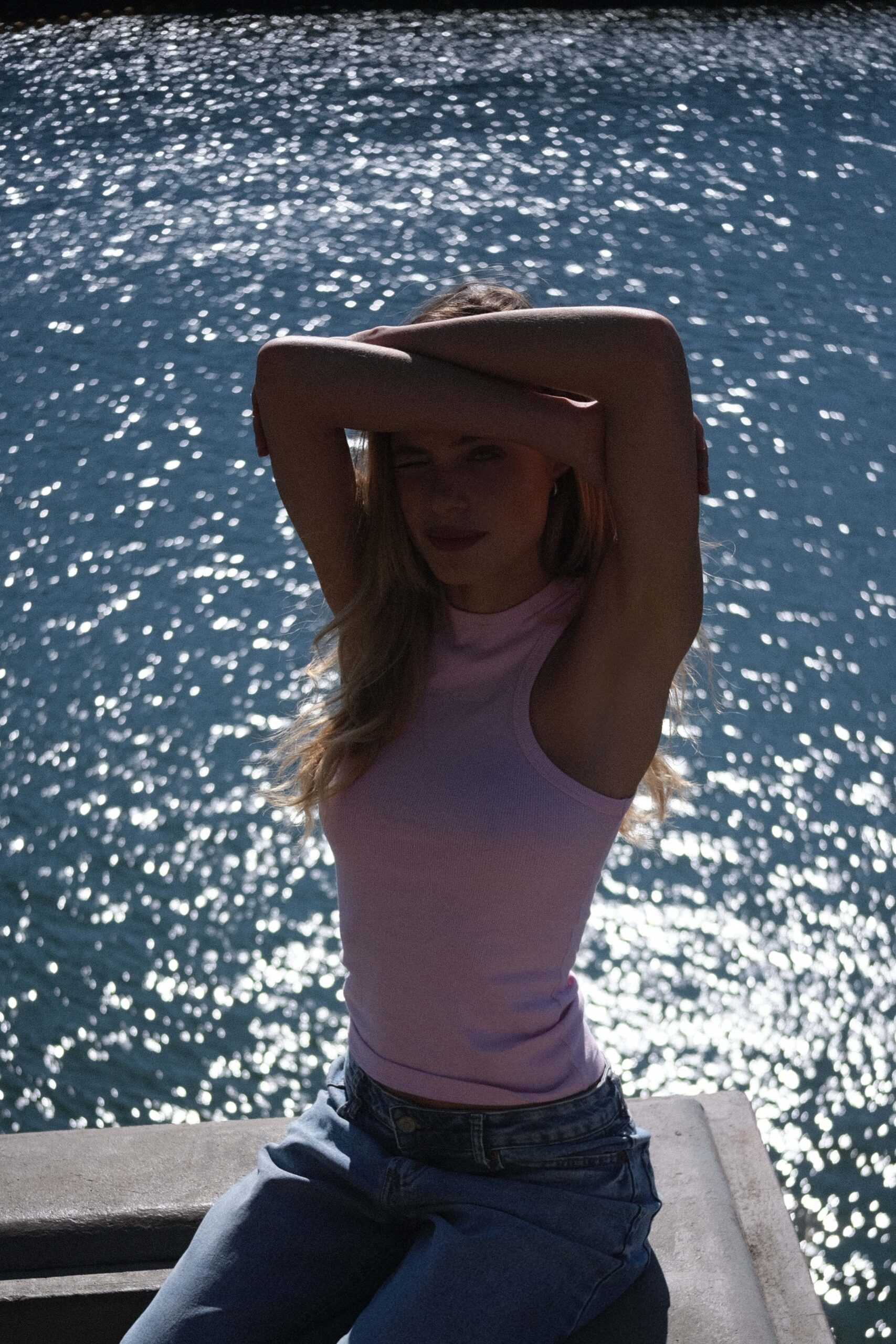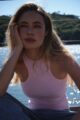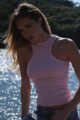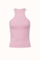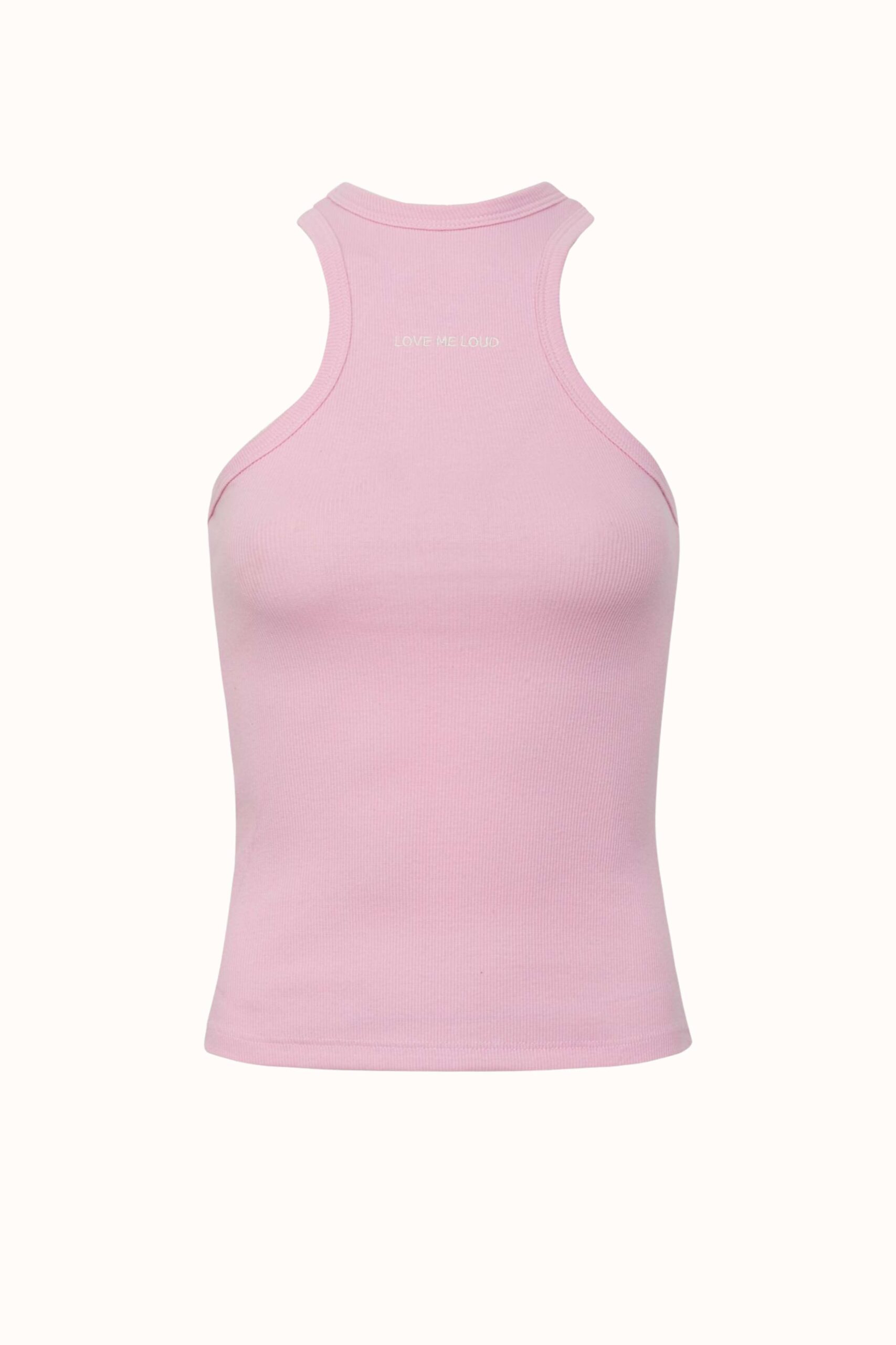 Regata canelada de algodão rosa claro, decote halter e com a frase “LOVE ME LOUD” bordada em branco.