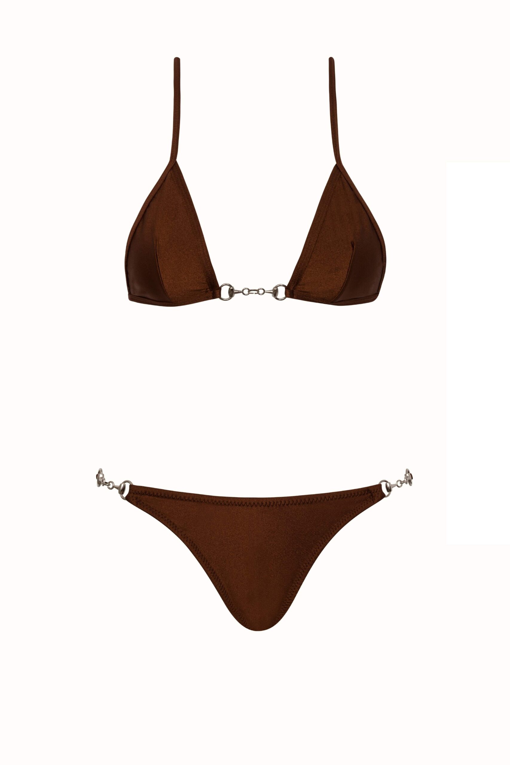 Top de biquini de lycra, todo forrado, em shape triângulo, com amarração. Possui aviamento chain de metal exclusivo.