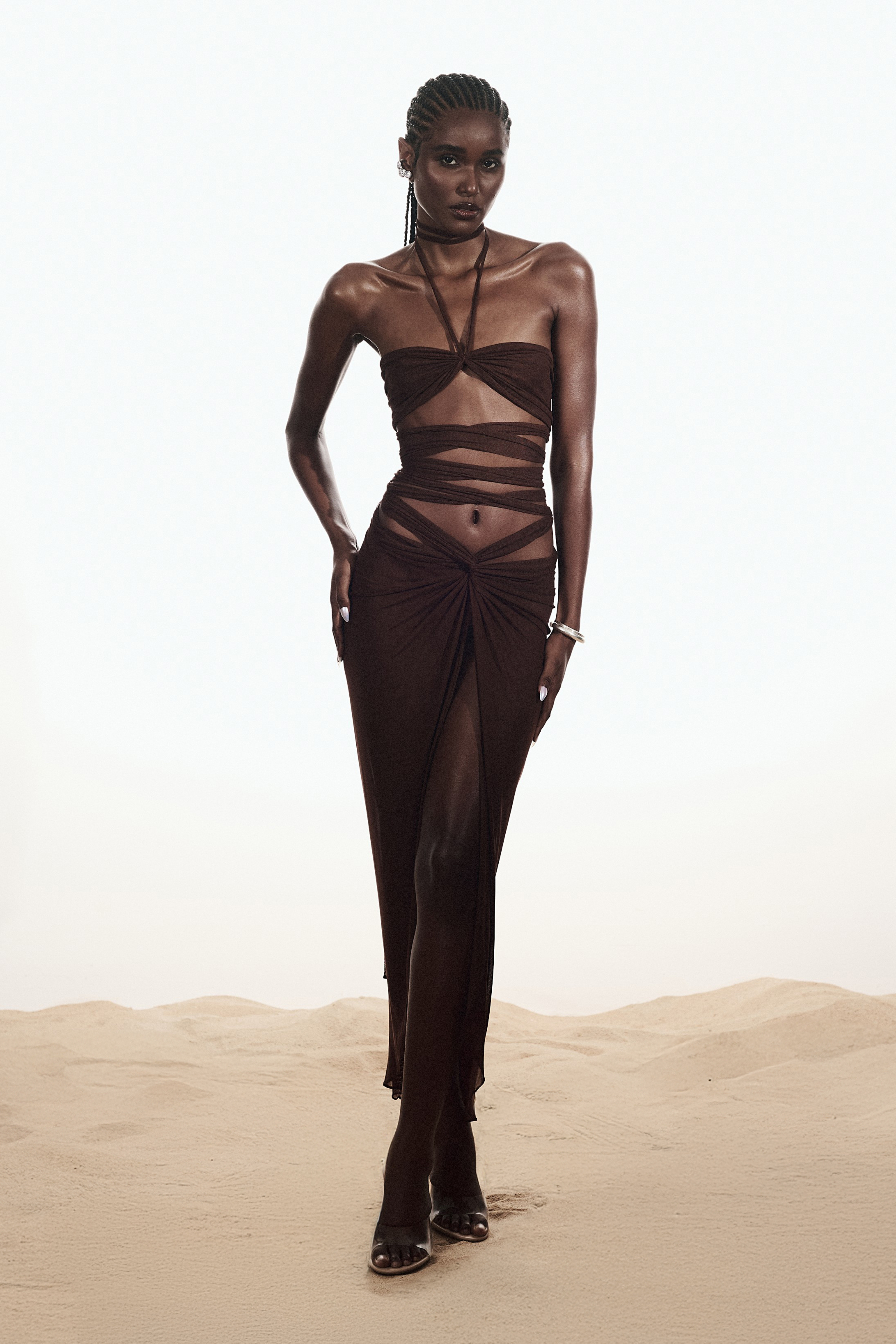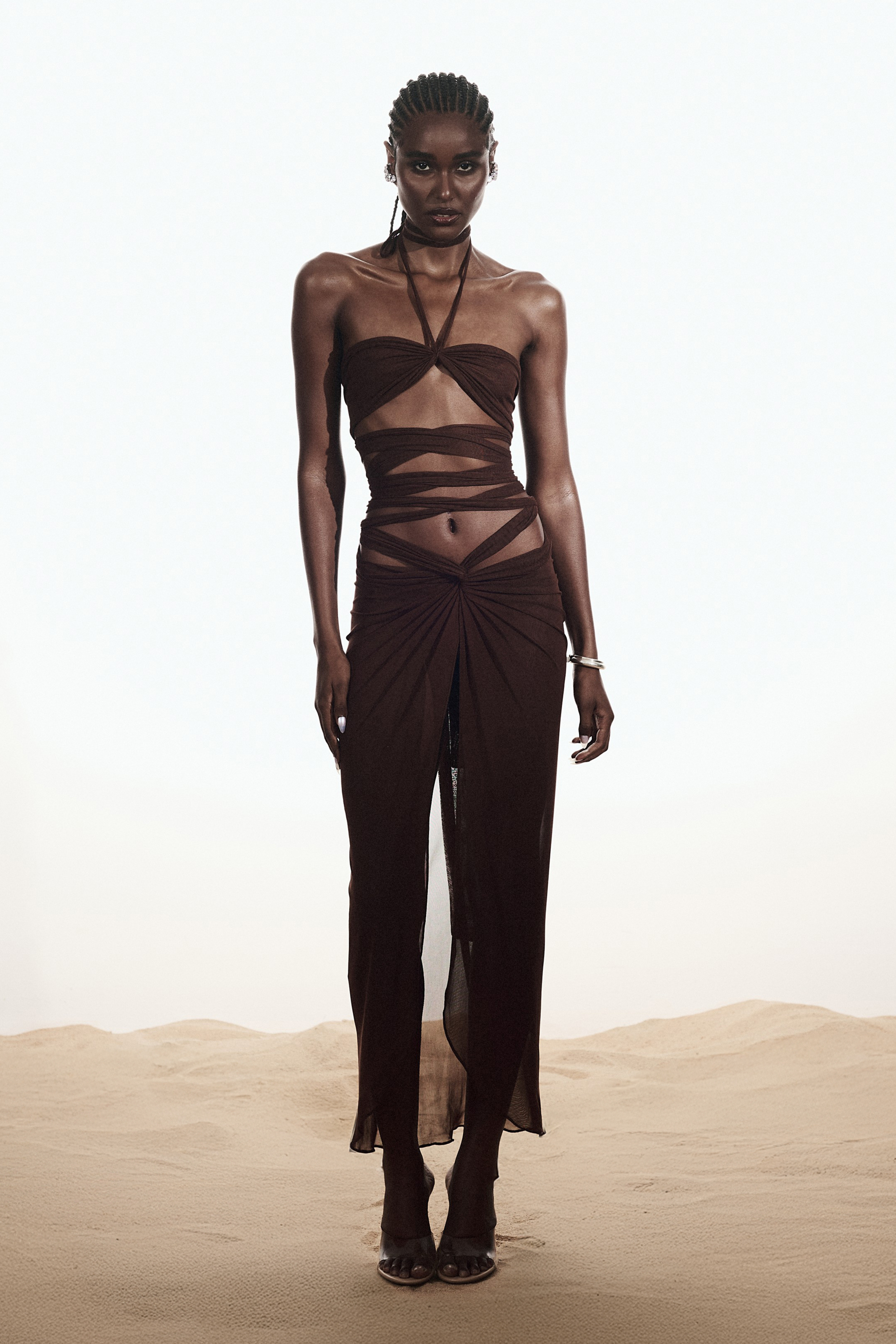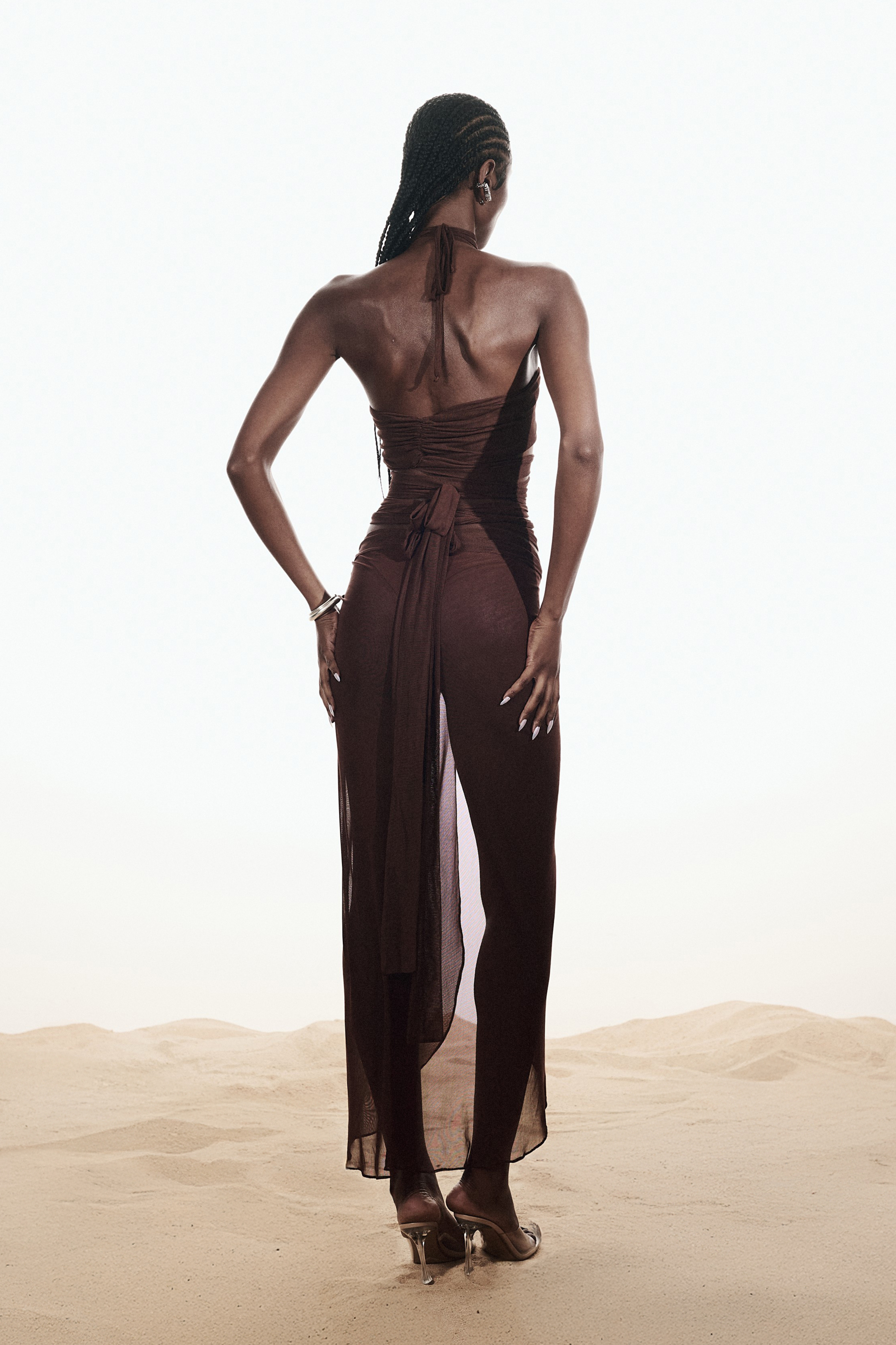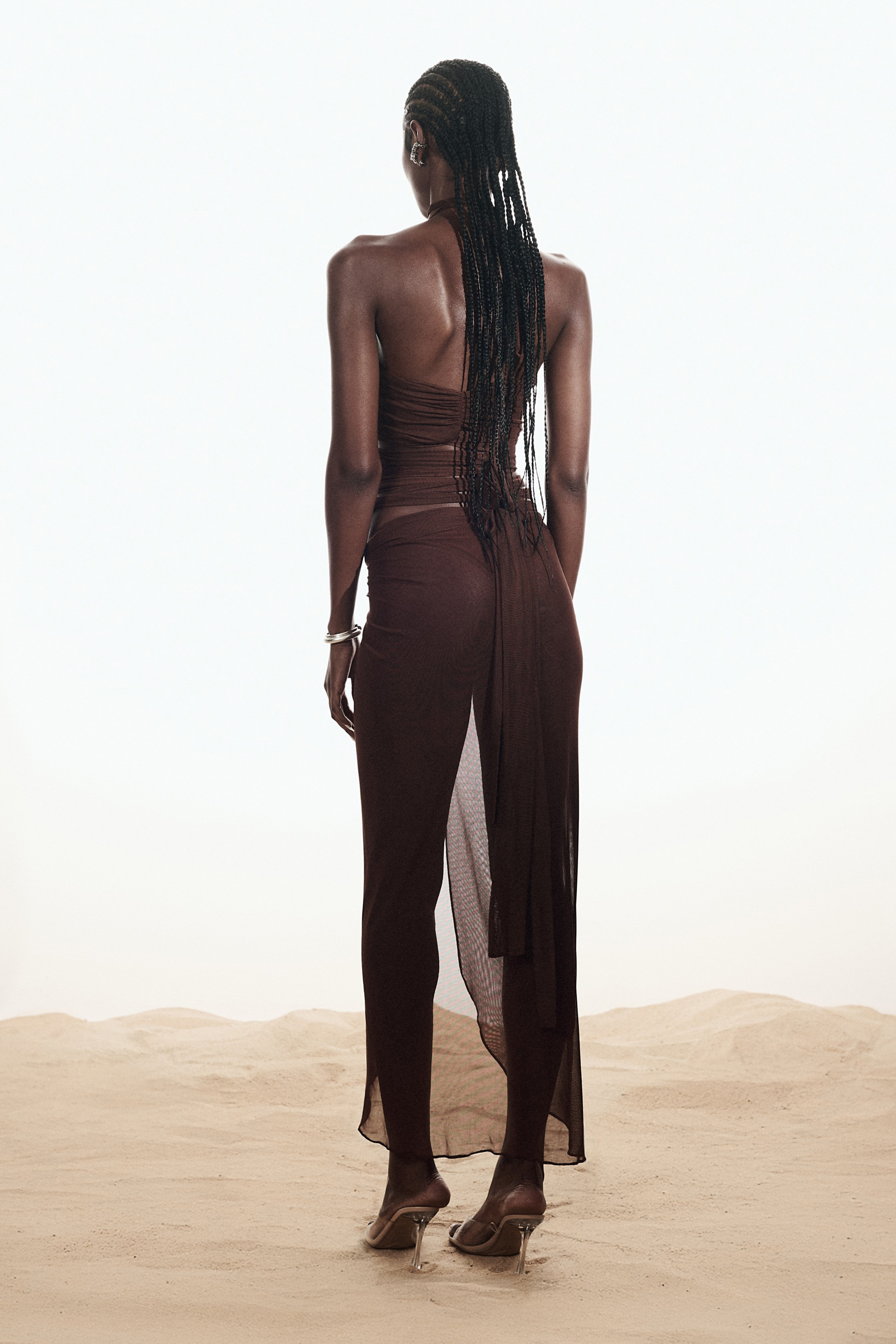 Top de tule, todo duplo, com tiras longas para amarração ao longo da cintura, e alça fininha para amarração no pescoço. Na foto, combinamos o Top com a Saia Pareô Nó no mesmo tecido.