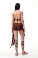 Top de musseline marrom todo duplo, frente única, com assimetria entre os lados. Caimento fluido e leve. Fecho de botões forrados no pescoço.