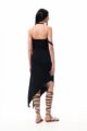 Vestido de malha Jersey preta, com caimento justo ao corpo que valoriza a silhueta. O decote quadrado e a alça caída criam um visual moderno e feminino, enquanto a barra assimétrica adiciona movimento e leveza, além de alongar a silhueta.