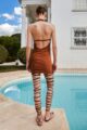 Vestido curto de malha jersey, com modelagem justa e com drapeado em toda a lateral da peça. Possui decote assimétrico com tira que envolve o pescoço. Fecho de biquini nas costas e fecho de botões forrados no pescoço.
