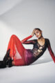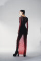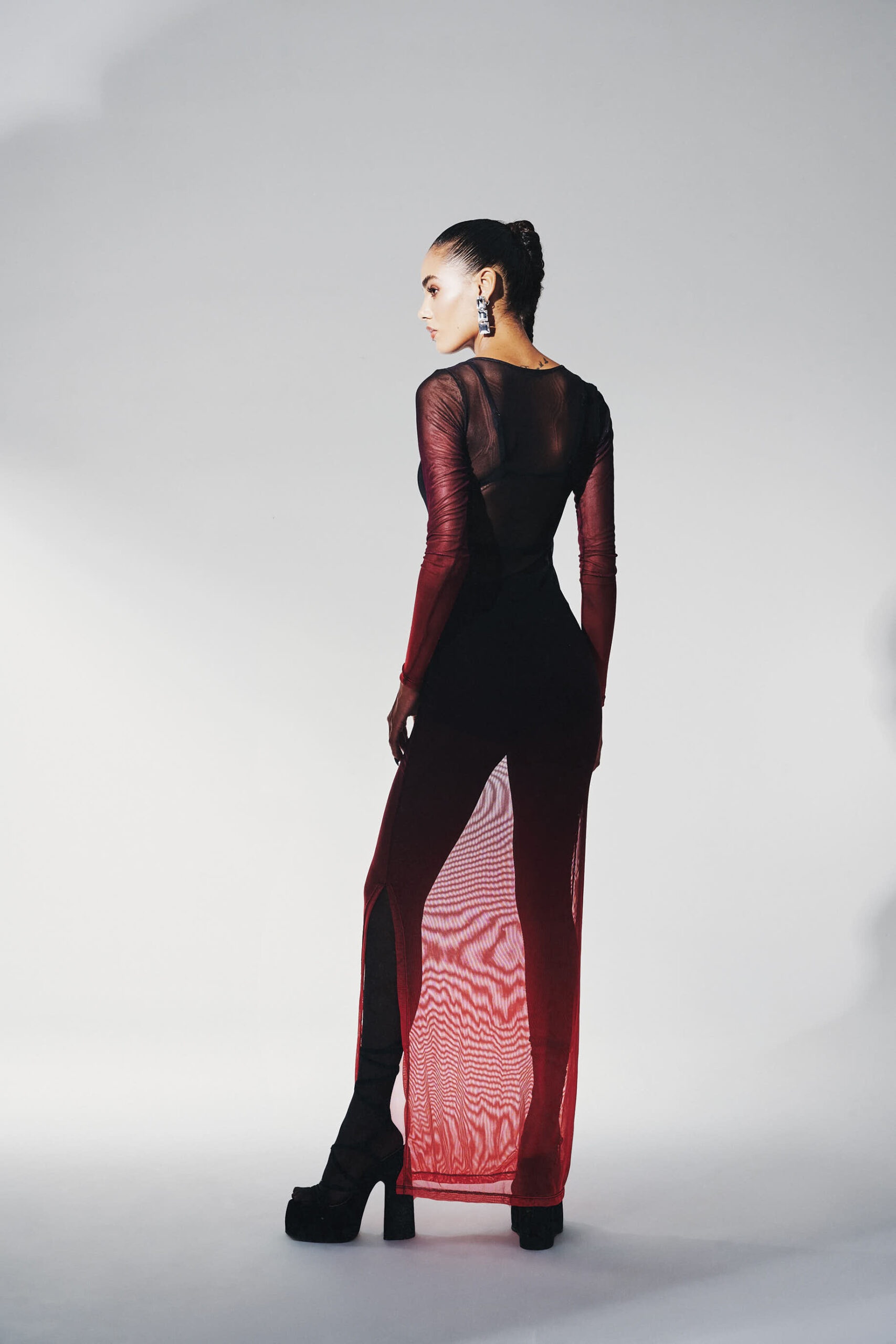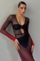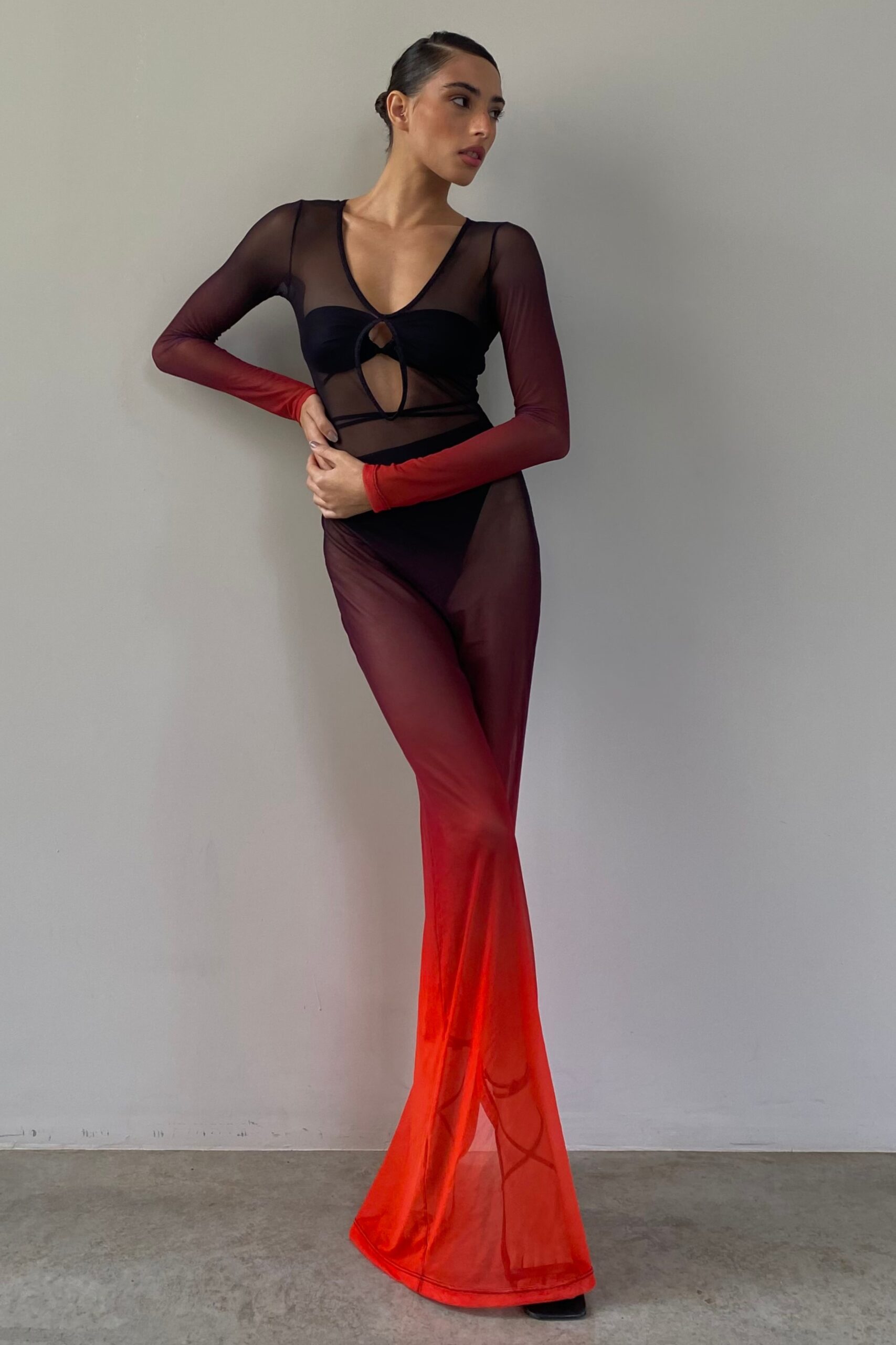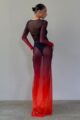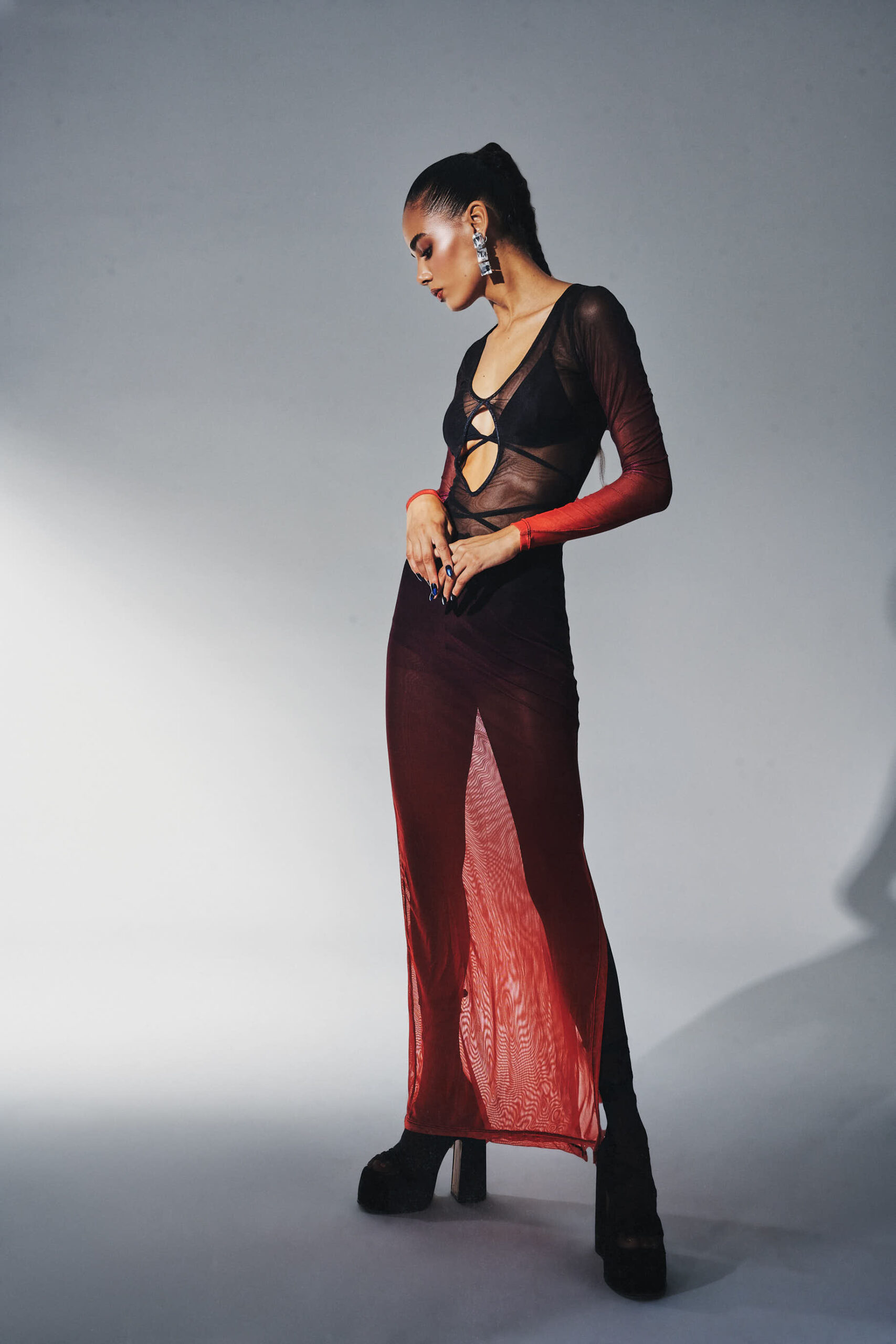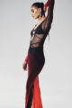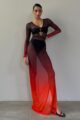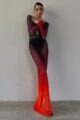 Vestido de tule com estampa exclusiva degrade preto e laranja, mangas longas e recorte em gota no busto.