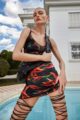 Vestido curto de cetim com estampa digital exclusiva e modelagem reta. Possui decote V, regulagem de tamanho na alça e aplicação de renda no decote.