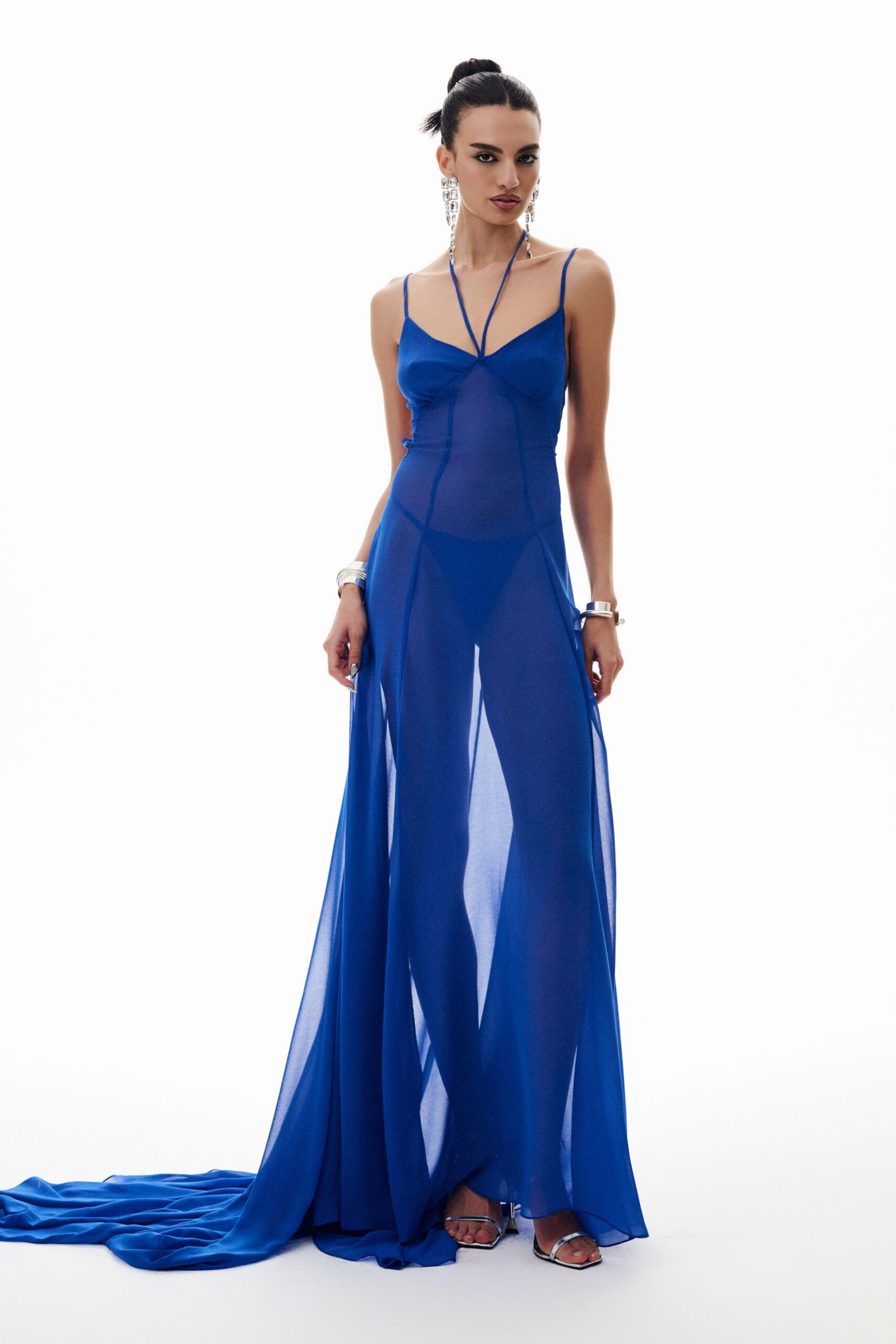 Vestido longo de musseline com cauda, decote profundo nas costas, busto forrado do próprio tecido e decote em V. A peça tem uma tira do próprio tecido para amarração no pescoço e as alças das costas possuem regulagem de tamanho. O vestido acompanha uma calcinha modelo tanga, confeccionada em tule, da mesma cor da peça, com forro de lycra.