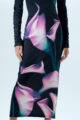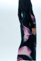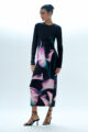 Vestido de malha jersey com estampa digital exclusiva, tamanho midi, com manga drapeada.