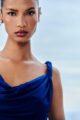 Vestido de malha todo duplo com drapeado lateral, decote slip e torção em uma das alças.