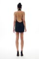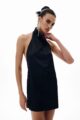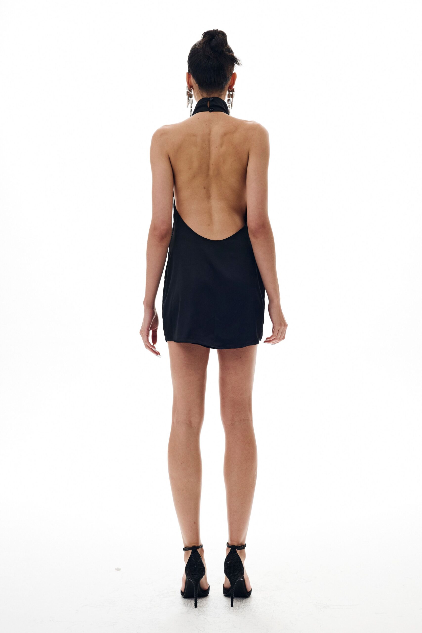 Vestido de cetim, todo duplo, com decote slip alto no pescoço, modelagem reta e decote profundo nas costas. Possui dois botões forrados do próprio tecido no fechamento da gola.