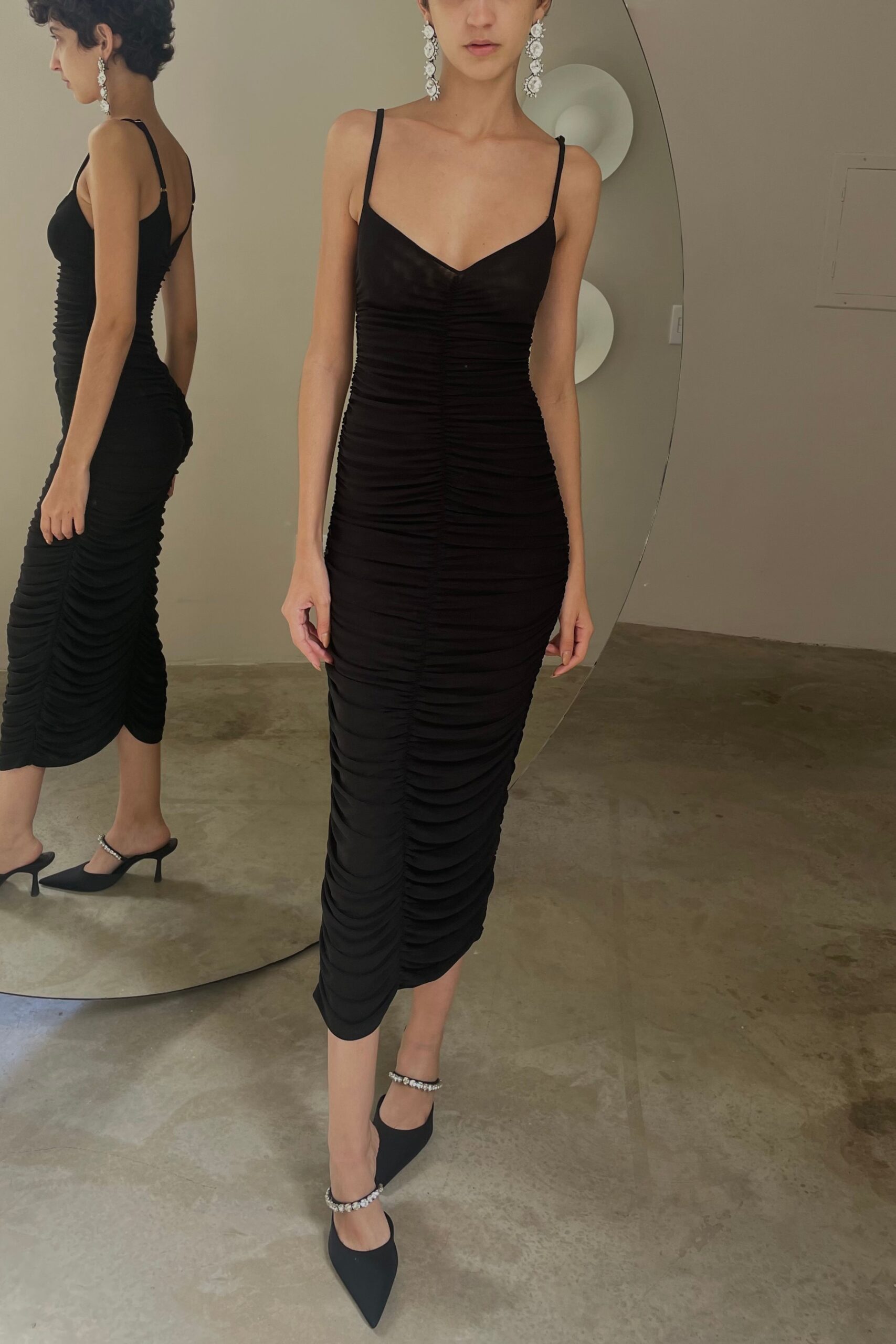 Vestido de tule todo duplo, com drapeado no centro e nas laterais. Alça com regulador de tamanho.