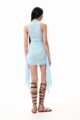 Vestido curto em Tule azul claro. Modelagem ajustada ao corpo e efeito drapeado ao longo de toda a peça, que à torna exclusiva e contemporânea.