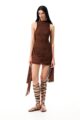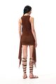 Vestido curto em Tule marrom. Modelagem ajustada ao corpo e efeito drapeado ao longo de toda a peça, que à torna exclusiva e contemporânea.