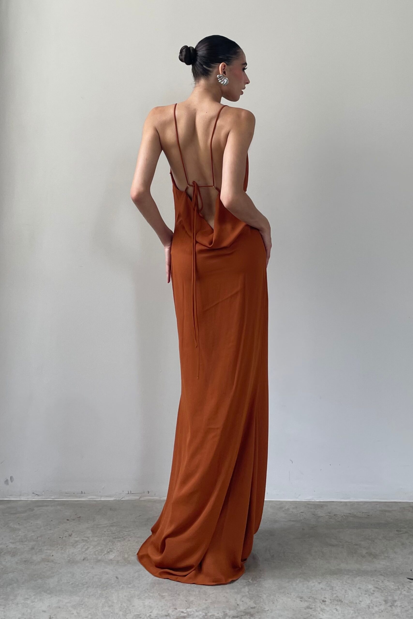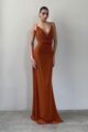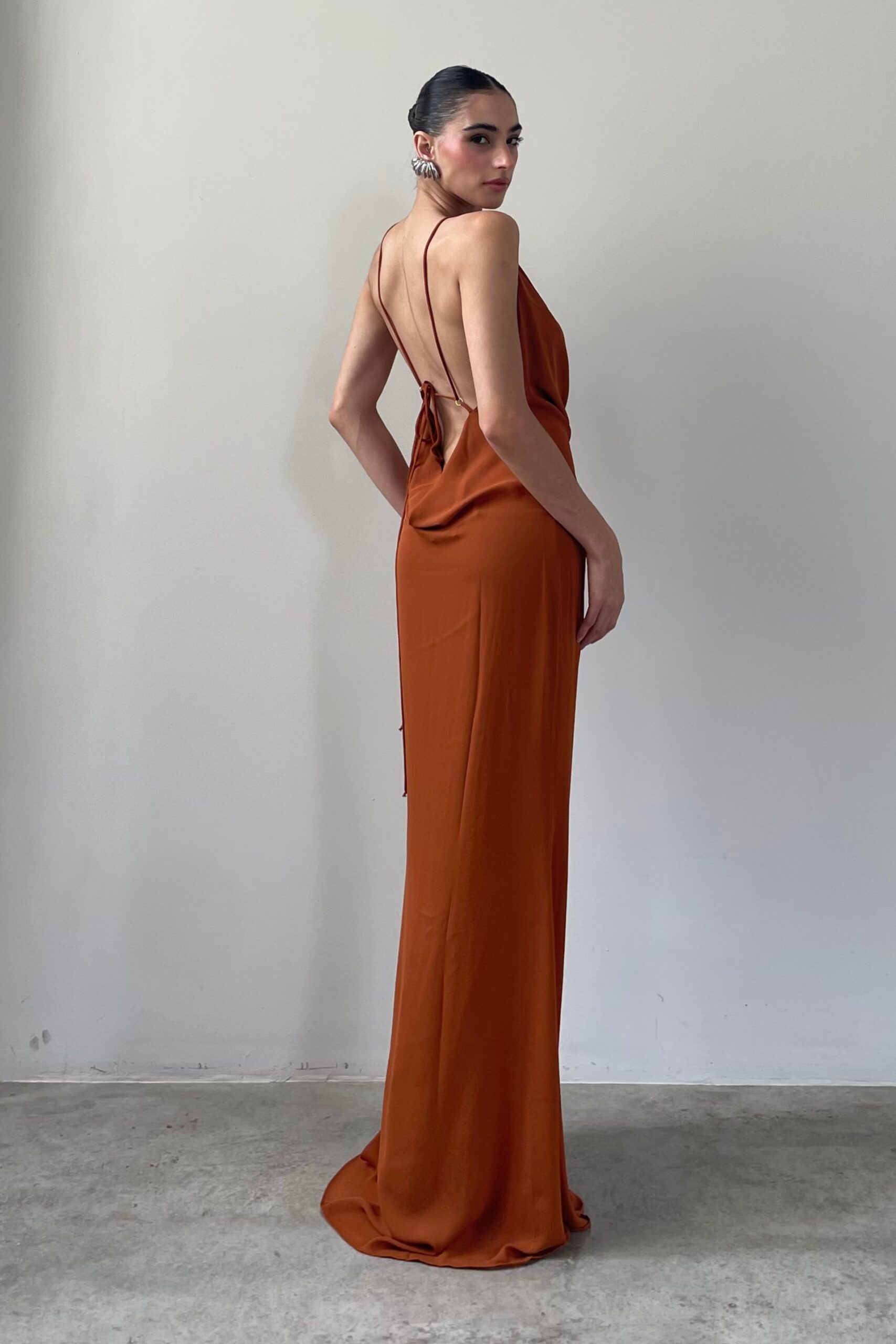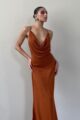 Vestido de musseline longo sereia, com decote slip no busto e nas costas. Busto duplo e alça regulável.