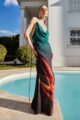 Vestido longo de musseline com estampa digital exclusiva, modelagem sereia e decote slip no busto e nas costas. Possui busto duplo e alça regulável.