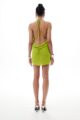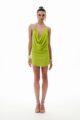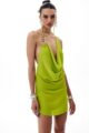 Vestido curto de musseline, todo duplo, com decote slip no busto e nas costas, com 3 argolas de metal entrelaçadas em uma das alças.