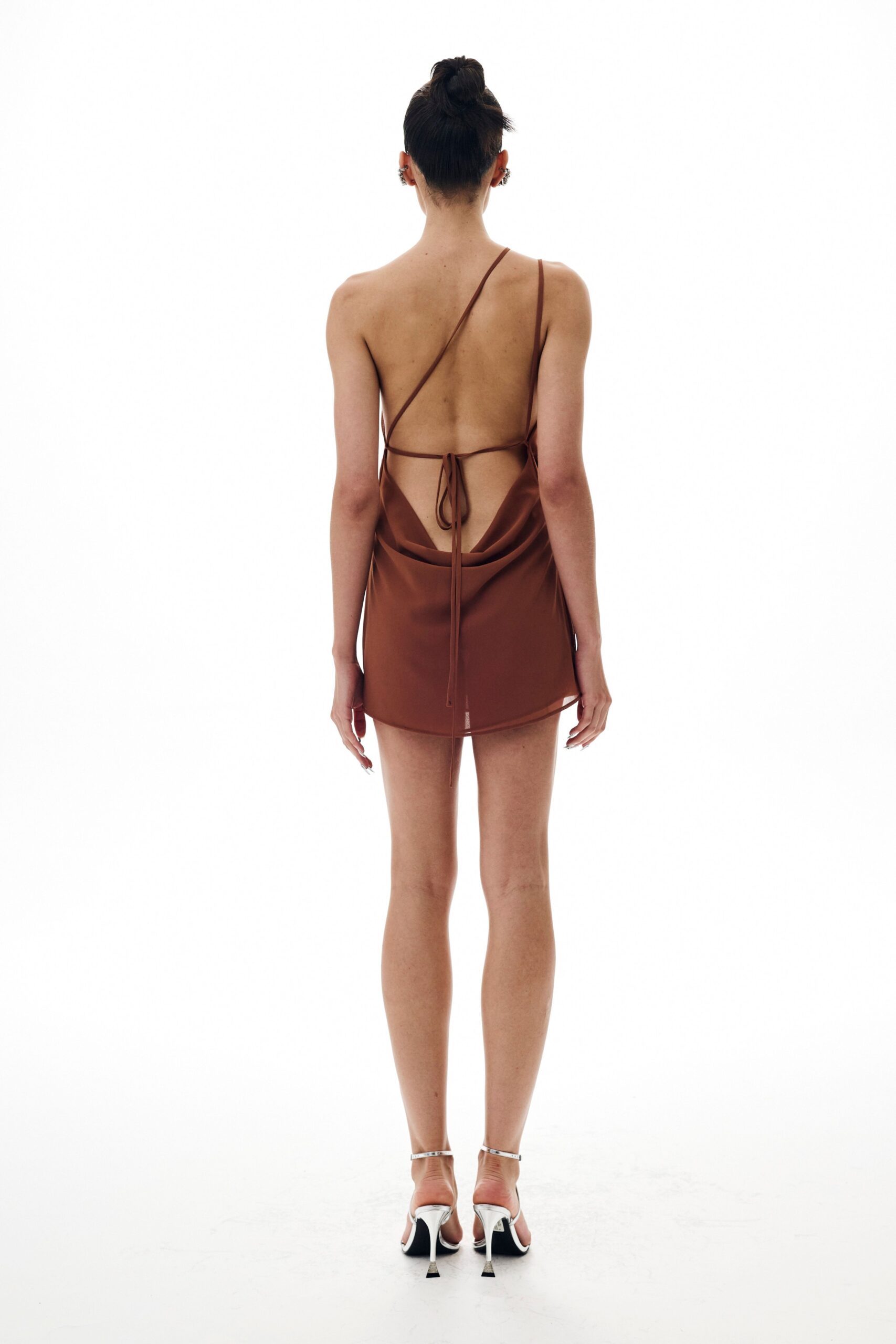 Vestido curto de musseline, todo duplo, com decote slip no busto e nas costas, com 3 argolas de metal entrelaçadas em uma das alças.
