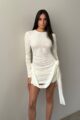 Vestido de tule offwhite, todo duplo, com mangas longas drapeadas e detalhes de flores laterais feitas manualmente em nosso atelie.