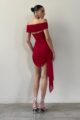 Vestido de tule com decote ombro a ombro, cruzado na frente. Busto e costas com forro do mesmo tecido, com detalhe franzido e assimétrico na lateral.